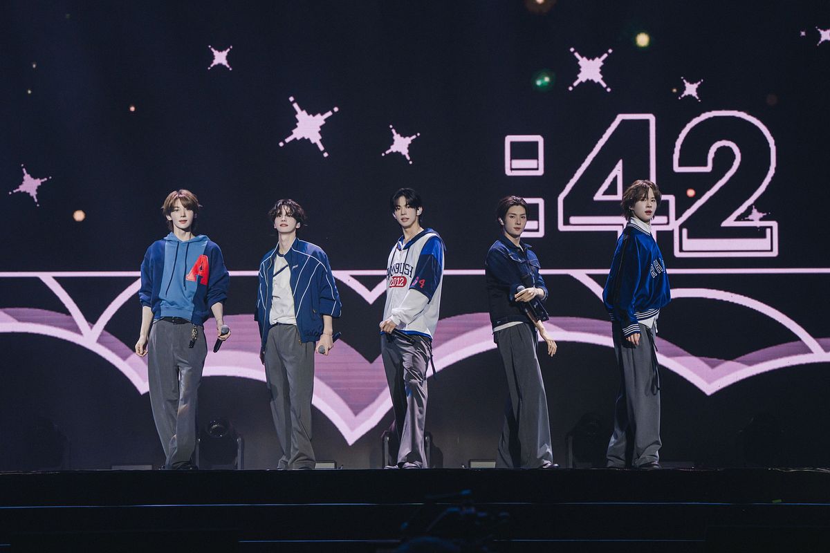在談話環節中,成員們輪流分享連續兩天站上高雄舞臺、以及迎來巡演最終場的心情。大家一致表示,能在港都感受到如此熱情而真誠的支持,為這趟巡演留下非常深刻的回憶,也感謝粉絲一路的陪伴。HANJIN 率先感性表示:「今天真的感到很幸福。」簡單一句話,道出站上最終舞臺的滿滿感動。DOHOON 則向粉絲表達深深感謝,坦言雖然演出即將結束,但未來一定還會有很多演唱會,要一直一起走下去。SHINYU 表示,多虧 42 們的應援,才能在巡演期間創造這麼多愉快回憶,希望大家能一直好好享受舞臺到最後;KYUNGMIN 則形容當天的歡呼聲與應援是「歷史級」,承諾會在剩下的舞臺全力以赴,帶給大家難忘的夜晚。YOUNGJAE表示感謝大家一起參與這個結尾,也希望成為大家美好的回憶,並用中文誠意滿滿的說「謝謝你們來看我們的演唱會!」