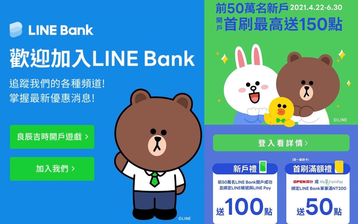 即日起到2021/6/30以前,前50萬名開戶成功的新戶,以LINE Bank帳戶綁定本人LINE帳號及LINE Pay帳號成功,立即送LINE POINTS 100點。另外,第1筆刷卡交易使用OPEN錢包或My FamiPay綁定LINE Bank快點卡在指定通路(7-ELEVEN實體通路及OPEN POINT APP [包含行動隨時取/i預購/ 7-ELEVEN線上購物中心]或全家便利商店實體門市及FamilyMart APP[包含隨買跨店取])消費單筆滿NT200以上,再送LINE POINTS 50點,等於總共贈送150點!