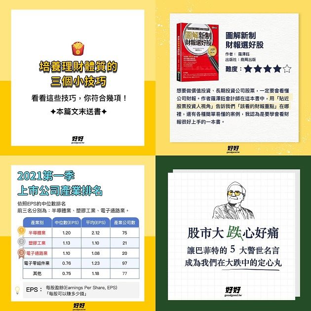 「好好理財」除了股票投資外,也會分享日常的理財小技巧,可說是每天都幫投資新手打一劑強心針呢!除了有許多專有名詞講解、趨勢分享外,還包含了理財書推薦、理財觀念等,讓你在進場投資前就先建立良好的金錢運用關念!