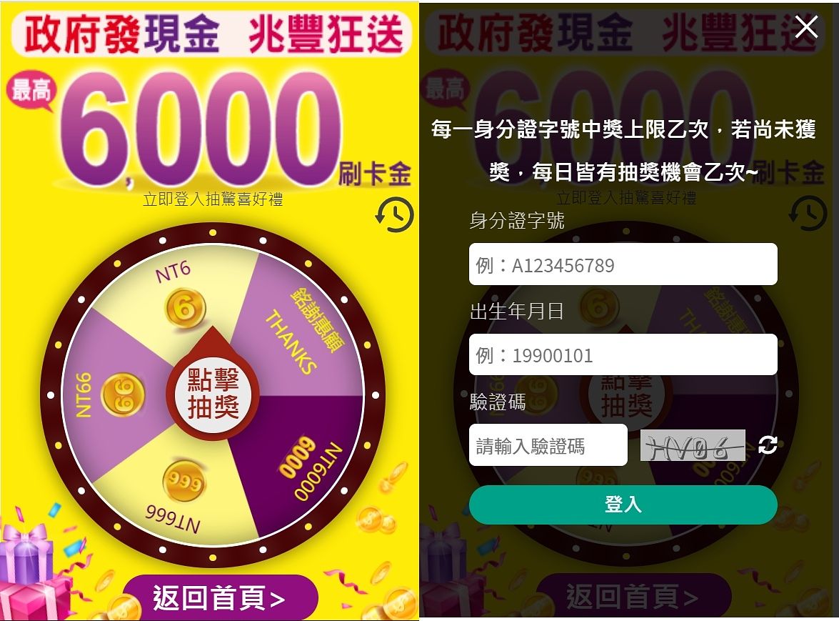 兆豐銀行推出「政府發現金 兆豐狂送6,000刷卡金」轉轉樂活動,即日起~4月7日,凡持有兆豐信用卡或VISA金融卡,於活動網頁抽刷卡金,並且綁定兆豐銀行LINE個人化服務,以及以兆豐信用卡/VISA金融卡累積新增一般消費達抽中金額,即可享受回饋。最大獎6,000元,其次還有666元、66元及6元等上萬個獎項。