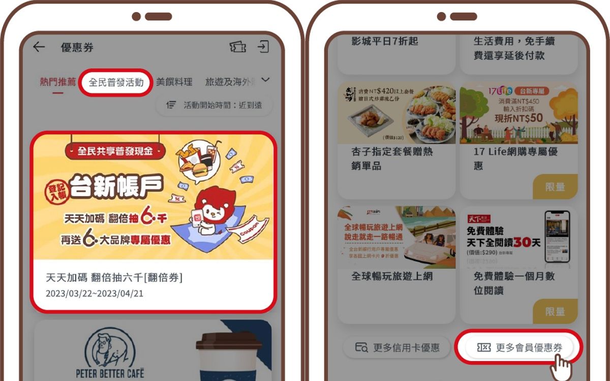 即日起~2023/04/21,於「台新行動銀行App」領取天天加碼 翻倍抽6千翻倍券,並於政府「全民共享普發現金」網站「登記入帳」台新銀行「台幣帳戶」(含Richart數位存款帳戶) ,且於2023/05/31前成功入帳, 可參加天天翻倍抽帳戶回饋金NT$6,000,還可領取6大品牌專屬優惠券!