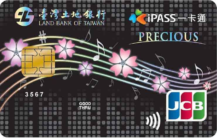 由台灣土地銀行發行的 JCB一卡通聯名晶緻卡,卡面以沉穩的黑色襯底,一朵朵粉紅櫻花與音符舞動在五線譜上,活潑又浪漫。此張信用卡主打消費回饋無上限,但相對地回饋趴樹就較為普通了~。國外消費不限金額一律回饋1%,國內消費依單筆消費金額設定不同回饋比例,最高可達1%。