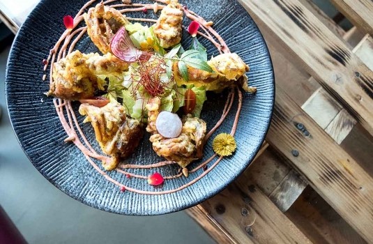 精選大型帶有蟹膏的高品質軟殼蟹,飽滿的蟹肉與鮮甜的蟹膏經過酥炸後仍然保有新鮮原味,外層的炸衣就算稍微放涼依舊保有酥脆,爽口不油膩,正是好食材與優秀料理方式的高規格組合。而在軟殼蟹料理的餐酒搭配方面,精釀啤酒與帶有果香風味的白酒都是很好的選擇。