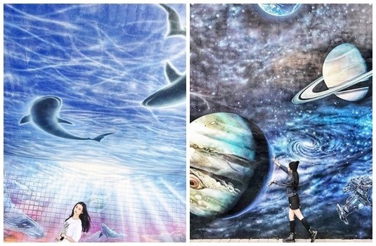 整個校園幾乎都成為了3D彩繪藝術的畫布,從網友們IG上的打卡照,可以發現校園內最熱夯的便是司令台的深海世界,以巨大、擬真的鯨豚搭配變化萬千的深海色澤,更有美麗的光線變化,另外側牆上的太陽系星球與宇宙銀河也是夯景之一,整個畫作非常巨大壯觀又吸睛,讓人漫步在浪漫又閃耀的宇宙中好特別~