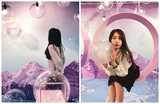 展場內的紫藍色色調非常迷幻,不會過度粉嫩,反而有種神秘奇異感~旁邊牆上的背景是山稜造景,完全像在外太空看地球一樣,加上掛在頭上的超多透明泡泡,裡頭散發著燈光,真的超有氣氛!就好像近期流行的LED燈氣球,是這次展覽最特別最吸引人的地方~拍起來完全像仙境!