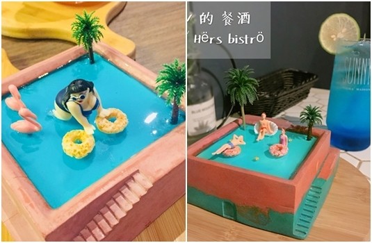 這間位於松山創意園區附近的「Hërs biströ 她/的餐酒」近期在IG上超級火紅!因為這裡每一道菜餚都極致粉嫩可愛,從服務生一上菜的那一刻女孩們的心就會被瞬間激發!像是近期火紅的餐點之一「游泳池」其實是甜點芒果慕斯蛋糕,上方擺滿了優閒度假的迷你小玩偶,真的好療癒,挖開鮮豔的藍色泳池,下放鋪滿了滿滿的芒果,對於喜愛吃忙的女孩來說絕對不能錯過!另一道季節限定菜餚是「沙灘」,外表實在太可愛太精緻!從曬太陽的人、紅鶴到椰子樹每一個小細節都不馬虎,根本讓人捨不吃下肚,而內餡部分其實是檸檬提拉米蘇,甜中帶著一絲酸味,非常適合夏天的口感。