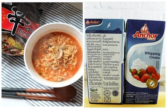 經典的韓國辛拉麵加蛋、加料吃不稀奇,倒牛奶、鋪上起司片也沒什麼新意,試試加進「鮮奶油」才是真正好吃!這其實是V編為了消耗烹煮義大利麵剩餘的鮮奶油,而自創出的新吃法,沒想到意外好吃到念念不忘!它會比加牛奶和起司更有濃郁奶香,甚至口感會十分滑順,也會降低辣度、豐富整體滋味!配上Q彈的拉麵,整碗可以立刻解決!如果妳喜歡辛拉麵一定要試試!也有網友推薦台灣經典來一客海鮮口味泡麵加杯熱牛奶,會瞬間變牛奶鍋風味喔~