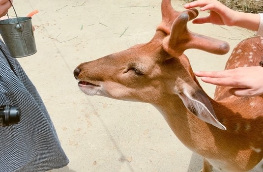 遊客來到這裡,最有趣與可貴的體驗莫過於與梅花鹿們的近距離接觸。園區依據時段分別供應牧草、紅蘿蔔、地瓜、鹿米讓遊客向鹿兒們餵食,除了讓餵食增加豐富性,也讓梅花鹿能均衡攝取各種營養。(這時編忍不住問道:眾多的遊客不停餵食,要怎麼控制鹿兒們的進食呢?吃到太撐怎麼辦?)原來梅花鹿共有4個胃,而且只要牠們吃飽了就不會再吃。經過親自餵食體驗後,發現就算手上拿著牠們最愛的胡蘿蔔,有些鹿兒爭先恐後,有些則是說不吃就吃,看來還真是如此!