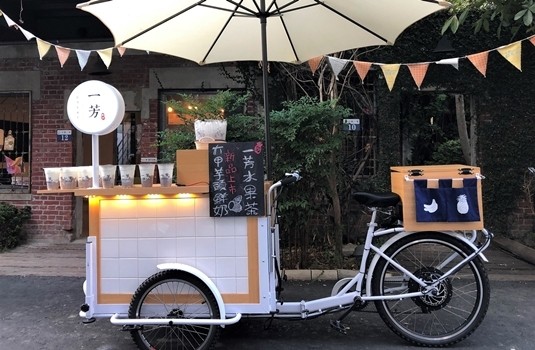 大甲芋頭鮮奶新品上市期間(12/5~12/31),一芳店員將不定期騎乘一芳「週末文青攤車」快閃現身台中市區,並穿戴芋頭裝化身「芋頭大使」,與民眾分享大甲芋頭鮮奶飲品 。