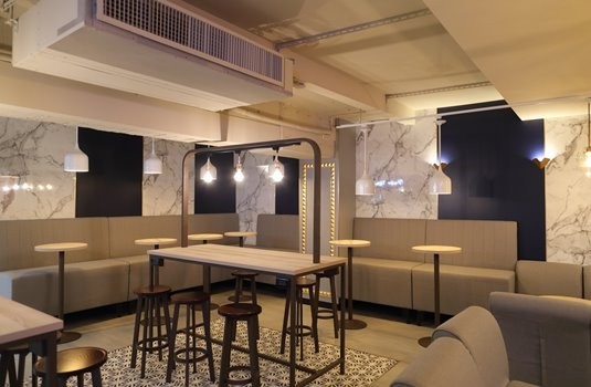 首家全家Let’s Café旗艦店共設有48個座席,提供免費網路與充電插座,以沙發、高吧桌、大長桌混搭成隨心所欲的咖啡館氣氛。空間氛圍更是採用低彩度灰、白、海軍藍的高雅「莫蘭迪」風格。