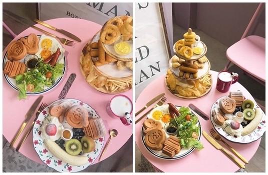 史奴比早午餐共有兩款,主餐的部分是造型鬆餅,三個鬆餅分別是史奴比、查理布朗、小狗屋,小巧可愛的模樣根本讓女孩少女心狂噴!而其中一款的配料是以水果為主,有藍莓、奇異果、香蕉等輕食,女孩可以淋上醬汁享用!而另一款則是以太陽蛋、蔬食沙拉、香腸做為配料,一天就用可愛揭開序幕真的超級幸福的!