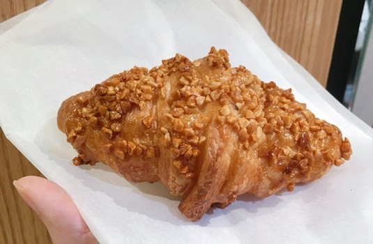8/1新上市的「太妃蜜糖杏仁果」,經典蜂巢可頌澆淋上香濃的太妃蜜糖衣,撒上杏仁果,用低溫烘烤技術烘烤,保留杏仁果口感的同時,感受與太妃糖相依的濃甜口感,可頌的香氣在口中蔓延,不會太過甜膩的風味,是一款接受度很高的甜味可頌,說實在的,品名中「太妃糖」「杏仁」2個關鍵字就足以讓人無法抗拒,兩者合在一起當然不會讓人失望。