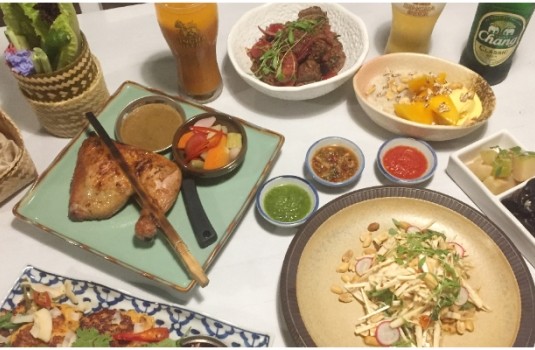 由於在大學時期主攻法式餐點,也因此在烤寨中的餐點,主要是以西式的料理方式,細心的對待每一道食材,減少了亞洲的大火炒、油炸,取而代之的是健康又低油的料理,而烤寨泰式餐酒館的每一道料理皆取自了 Calvin 對於曼谷的回憶,像是菜單上可見的雞腿、豬柳條或者是檳榔沙拉等,都屬於在泰國中,隨處可見的街邊小吃,其中的雞腿更還原了泰國常以竹籤、竹叉將食物串起的烘烤方式,使得台灣食客可以完整的體會到泰國風情,而這一道料理也附贈了泰國糯米飯、生菜以及 4 種醬料可讓食客們選擇,擺盤方式雖然有著法式餐點的精緻,吃下去卻是 Calvin 內心澎湃的家鄉滋味。