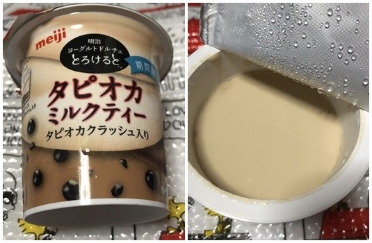日本食品大廠明治也跟上珍奶潮流,推出珍珠奶茶口味的優格,讓人光是看到就難以想像它的味道,畢竟珍奶大多都是甜的,而優格口味偏酸,這兩者混合在一起,味道真的感覺奇耙,上層式奶茶味的優格,底下搭配紅茶醬以及珍珠,每一口都可以吃得到Q彈口感。
