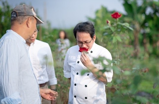 「南國玫瑰女王乳酪蛋糕」一大亮點,就是選用「屏東大花農場」的大花一號有機玫瑰,農場主人楊添得原本是全國花藝大賽冠軍,在花藝界小有名氣,但一旦決定從觀賞花卉市場轉戰食用玫瑰有機農業,他堅持,「要給人吃的,一定不能噴藥。」熬了三年時間探索出靠水驅動的循環生態系,種出花青素含量高的大花一號、大花二號玫瑰。