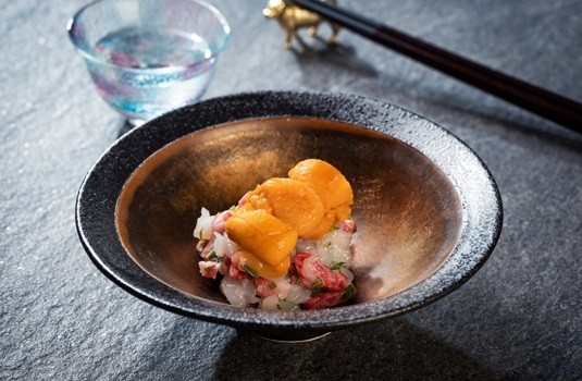 北海道海膽及干貝搭配著日本和牛之精華切成丁狀,三種截然不同的甜味在嘴裡奔放。