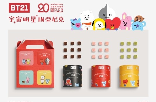 來自BT星球的王子TATA,夢想著有一天能將愛傳播到全宇宙,為了實踐夢想, TATA與守護者宇宙機器人VAN踏上旅程來到了地球。到地球後,TATA發現散播愛最好、最棒的方法就是成為明星,不對……是宇宙明星!於是TATA跟VAN開始尋找擁有共同目標的朋友! 最後他們認識了 KOYA, RJ, SHOOKY, MANG, CHIMMY 和 COOKY,夢想成為宇宙明星的BT21就此誕生! 各自擁有不同魅力,在一起時更閃閃發光的BT21! 迎著夢想奔跑的BT21他們之間發生的愉快而又感動的故事會一直繼續。同樣秉持「分享。讓心融化」的亞尼克,此次與BT21共同打造「奶黃金沙」生乳捲、BT21石疊系列商品,並推出限量超萌保冷袋、大容量厚實手感咖啡杯盤組!期待愉快而感動的故事會透過分享甜點讓愛一直傳遞下去。