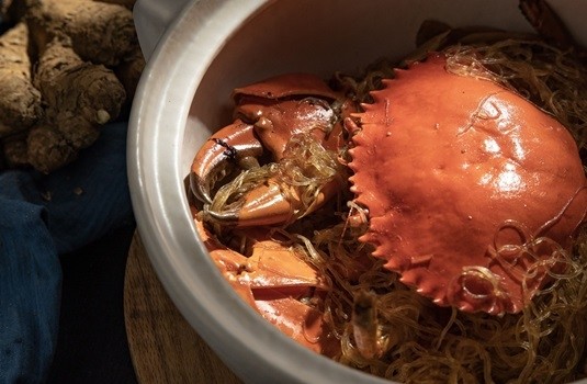「豬肉榮」、賣魚的叫做「賣魚勝」、賣菠菜的叫做「菠菜蓮」...等。這位販賣豬肉的榮哥,他精打細算的老婆榮嫂將每日多餘的豬肥肉煉成油,與新鮮海鮮以大火快炒,意外創造出更為上乘的風味,流傳至今成為香港一般家庭會用來烹調螃蟹的家常口味。主廚特選菲律賓進口的沙公,由於當地沙公生長於淡海水交界處,得天獨厚的環境造就出肉質飽滿紮實的口感,料理時要先洗淨切塊後以生粉清裹後放入熱油中炸熟撈起,再與爆香的薑、蔥、蠔油、豬油渣拌炒,放入粉絲,最後再置入砂鍋中煲煮收汁而成,上桌時撲鼻而來的濃郁香氣,搭配螃蟹鮮美的肉質與Q彈粉絲,是專屬秋日的暖心滋味。