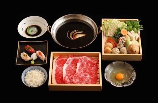 使用和牛油爆香洋蔥,加入醬油、清酒、糖及昆布高湯烹煮成壽喜燒鍋,滋味鹹甜、香氣四溢,煮滾後涮煮牛肉與蔬菜,牛肉吸附甘美壽喜燒醬汁,沾附蛋黃入口,肉質柔嫩甘美。煮過牛肉與蔬菜的濃郁湯汁最後加入蛋液交融,拌炒至滑蛋狀態,覆蓋在越光米飯上,醬香撲鼻、軟嫩金黃的玉子與剔透香Q米飯交融出銷魂完美滋味。