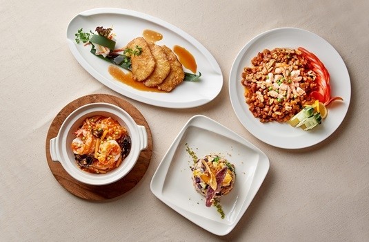【秋饗旬味.浪漫食光】集結了蓬萊邨、珍珠坊、麗香苑、江南春、七賢吧及點心坊,活用當令食材並融入主廚精湛手藝,巧妙地帶出秋季料理的溫度與豐富層次。從蓬萊邨的「酒釀乾燒蝦」就能感受到主廚的巧思,從鮮豔醬料、啵啵聲響、濃烈酒香到鮮甜大蝦,視覺、聽覺、嗅覺到味覺的多感體驗,完整了這道料理的靈魂,而珍珠坊的「醬燒藍斑魚」也是不惶多讓,將鮮嫩的藍斑魚醬燒以提升口感,軟嫩中帶著香氣,每一口都令人意猶未盡,以多國料理為主的麗香苑則將創新精神發揮得淋漓盡致,推出「彩虹堅果甜山芋炒飯」,以健康養生的理念出發,透過師傅獨特工法,使傳統炒飯有了全新樣貌,另外更不能錯過江浙餐廳江南春主打的「核桃鬥八鮮」,精選江浙老菜中的八寶辣醬,承襲原有風味的同時注入多項新元素,其中更以美國核桃為特色,爽脆口感使整道料理更上一層樓。