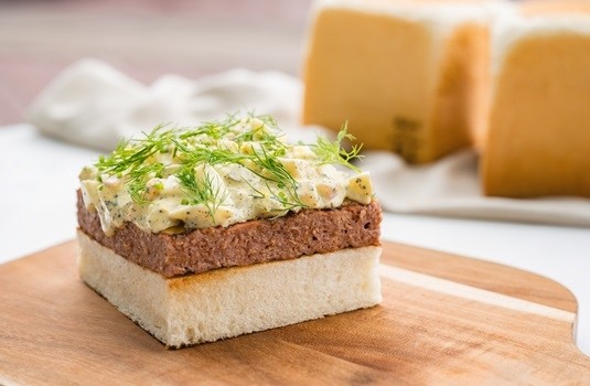 林明健主廚選用嵜本SAKImoto Bakery『極生吐司』製作三明治,極生吐司使用日本小麥粉加入北海道產牛乳與鮮奶油、蜂蜜,以中種加湯種製法,經18小時低溫發酵,於2017年獲得SARAH JAPAN MENU AWARD最高3星的評價!厚切28mm經柴燒火烤,除原有的軟綿質地外,再增添煙燻香氣與微酥口感。