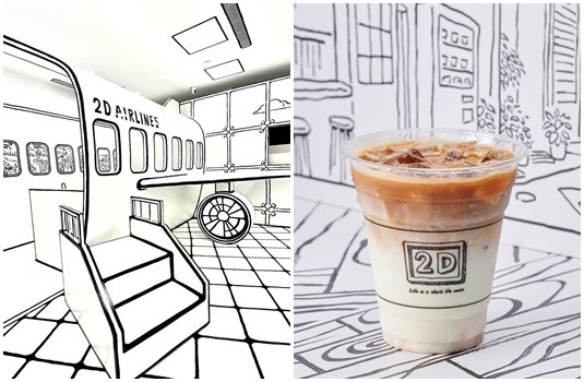店門口特意設計成安檢門的造型,消費者入內會先收到一張登機證,提醒大家留意自己的「登機」時間。用餐空間設計成簡約黑白線條打造行李輸送帶,行李箱化身成餐椅,除此之外,2D 101 店特地請技術團隊打造大型飛機,機翼及引擎與廚房連接作為出餐口,機艙內不僅有一般座位還有機師駕駛座,在機艙內用餐就像真的在坐飛機。
