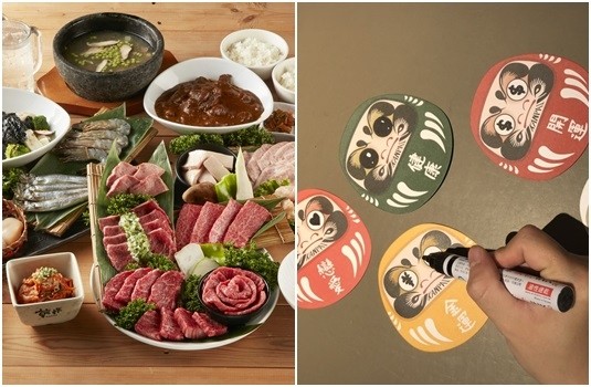 此外,套餐更特別設計「達摩不倒翁許願小卡」,沒有劃上眼睛的達摩不倒翁,是為了讓客人許下心中的願望。在日本,家家戶戶將達摩不倒翁做為吉祥物,祈求生意興隆、消災除厄。許願時,先在達摩的左眼上畫上黑眼珠子,等到願望實現時再將右眼畫上,慶祝心願達成。乾杯燒肉居酒屋期盼透過燒肉美味與達摩不倒翁的加持,讓人人在歲末揮別厄運、招好運。