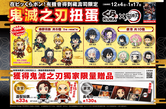 「鬼滅之刃劇場版 無限列車篇」上映後好評如潮,不僅成為台灣電影史上最賣座的日本動漫電影,鬼殺風潮更是襲捲全台!藏壽司此次搭上無限列車,從 12月4日起於全台店鋪推出一系列「鬼滅之刃」限量周邊活動,其中包含16款期間限定扭蛋;以及限量金銀賞活動,最大賞-金獎可以獲得竈門炭治郎及煉獄杏壽郎的獨家套組Q版玩偶;此外,只要消費滿額,就能將電影人氣角色限量文件夾帶著走!藏壽司用滿滿好禮,回饋喜愛「鬼滅之刃」的粉絲們,讓人氣角色陪伴藏友度過歡樂的用餐時光!