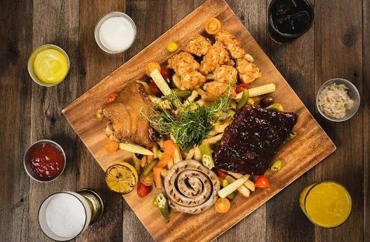 豐富肉類拼盤,同時享有德式圈腸、酥脆自製德國豬腳、輕辣櫻桃BBQ豬肋排、水牛城炸雞、風味炸脆薯、德國酸菜,佐以藍紋乳酪醬、蜂蜜芥末醬、蕃茄醬,適3至4人分享