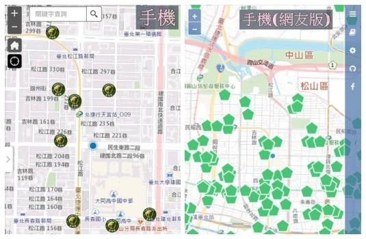 這個網頁的界面與使用方式上,邏輯與官方的差不多,不同的是圖示改以綠色五邊形,並且增加了導航功能!