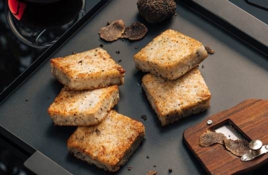 顛覆以往黑松露給人難以在中國菜入菜的印象,在黑松露和蘿蔔糕之間找到味蕾的絕佳平衡,黑松露的重香搭上白蘿蔔的清甜,撲鼻而來的黑松露香氣,沿著舌尖感受黑松露和蘿蔔絲的層次交疊,入口後餘香停留喉腔久久不散,帶給蘿蔔糕全新定義.