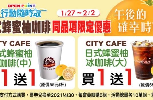 此外,為回饋OPEN POINT會員,即日起至1月31日也推出行動隨時取中杯熱飲限定優惠,享CITY CAFE中杯熱美式、中杯熱拿鐵、同品項買15杯送5杯,CITY CAFE中杯焙烤榛果風味拿鐵買3杯送1杯活動。即日起至2月2日,還有日式蜂蜜柚咖啡同品項買一送一,冰熱限量各10萬組,每位會員限購5組,售完為止。