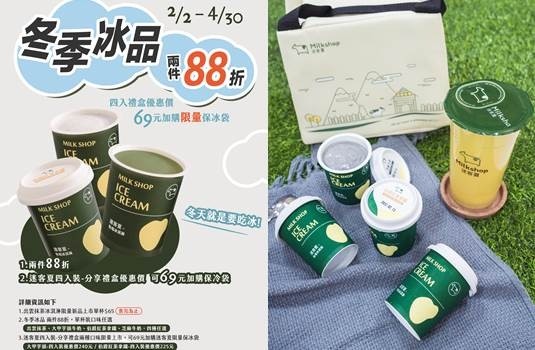 誰說夏天才能吃冰,冬天吃冰淇淋最過癮!迷客夏祭出冬季冰品優惠,包括大甲芋頭牛奶、伯爵紅茶拿鐵、芝麻牛奶以及最新上市的出雲抹茶口味,只要購買兩件單杯冰品立享88折,讓你冬天吃冰更爽快。除了單杯販售外,也同步推出冰淇淋分享禮盒,共有大甲芋頭牛奶和伯爵紅茶拿鐵兩種超熱賣口味,一盒四入,還可以加69元加購保冷袋。迷客夏最經典的冰淇淋口味,搭配上精美禮盒,絕對會是送禮的最佳選擇!