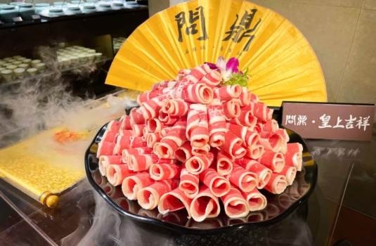 「問鼎·皇上吉祥宮廷火鍋」本次佔地達150坪,設有2至12人桌型,總桌數達37桌,客席可同時容納高達近200位。以宮廷文化發想,還沒走進店內,重金訂製,高達2米的凝土兵馬俑,氣勢非凡,接待區以貴氣表徵的紅木龍椅迎賓,側邊則是羅列齊全的龍袍鳳褂與配飾、道具,不論男女老幼都可以免費體驗;不僅如此,用膳的鍋鼎更是講究,特別開模訂製,全套要價15萬元,醫療級不鏽鋼打造,碗盤亦同名家繪製,貴氣逼人,就是要讓你做一個徹底尊爵霸氣的皇族!