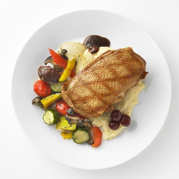 特選國產番鴨肉,營養豐富,肉質細緻,香脆烤鴨搭配酒漬櫻桃,口感扎實,經典烤鴨醬添加櫻桃香味讓風味再升級。