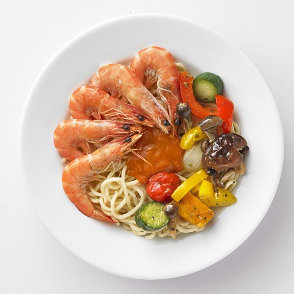 「白蝦烤蔬菜麵」特選ASC認證白蝦仁,搭配龍蝦風味醬,襯托出溫烤蔬菜的鮮甜,義大利麵條Q彈有嚼勁,低脂少碳無負擔。