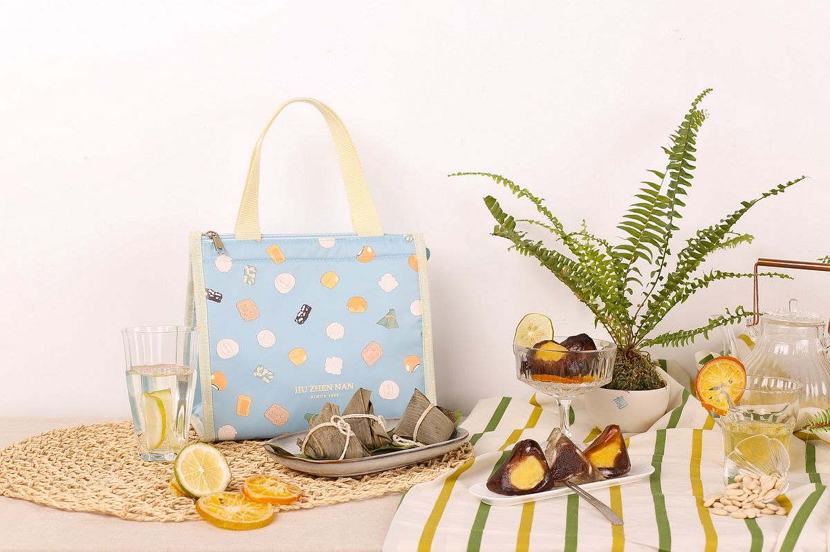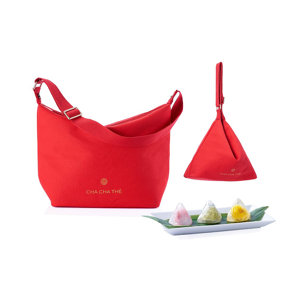 為了延長冰粽的沁涼風味,采采食茶今年更同步設計了質感不凡的「予悅藏溫袋」,不僅保溫,亮紅色布面搭配淺金色磁釦,可愛的新月型中散發時尚味,讓今年端午送禮更具新意與美意!