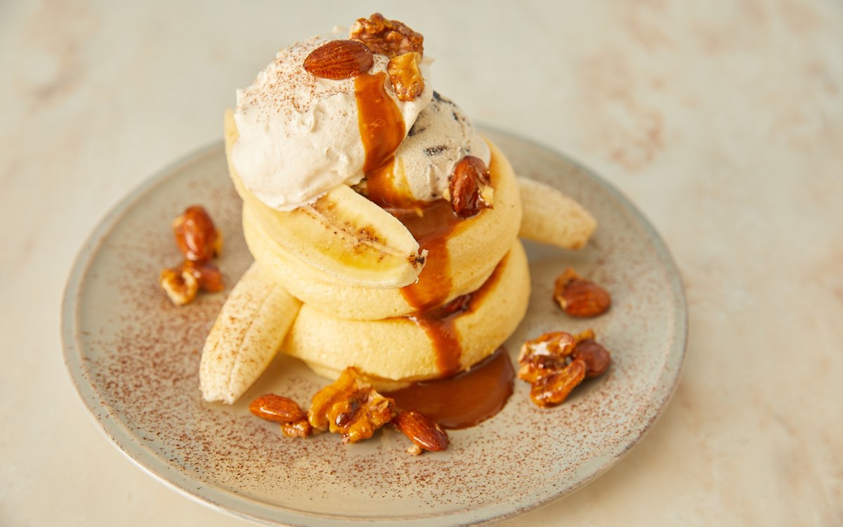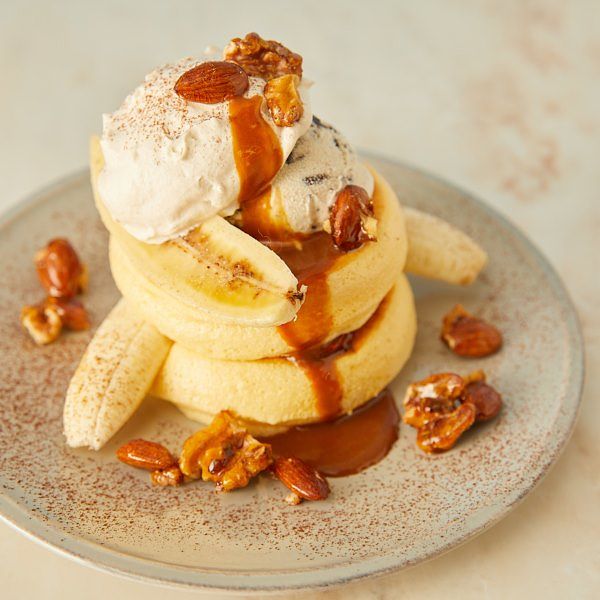 使用法國頂級鹽之花與森永經典牛奶糖淋醬製成最優雅的大人系焦糖舒芙蕾鬆餅,裹上糖衣的堅果脆粒與鹽之花焦糖鮮奶油帶您一起回憶兒時最愛的滋味!