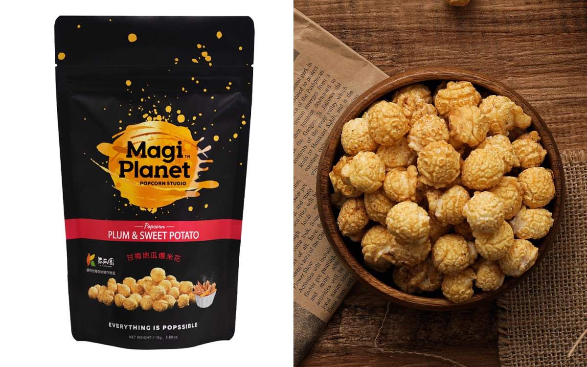 選用台農57號黃金地瓜,搭配嘉義梅山半熟青梅,巧妙融合溫醇甜香的地瓜與酸香開胃的梅子,獨特酸鹹帶甜的風味,等同複製傳統甘梅地瓜的做法,將原味爆米花高溫爆炒後,混搭瓜瓜園台農57號地瓜粉,最後撒上嘉義梅山半熟青梅調味,一口咬下可嚐到梅子酸甜滋味,再來則是地瓜香氣在尾韻散開,襯托出整體爆米花的層次!