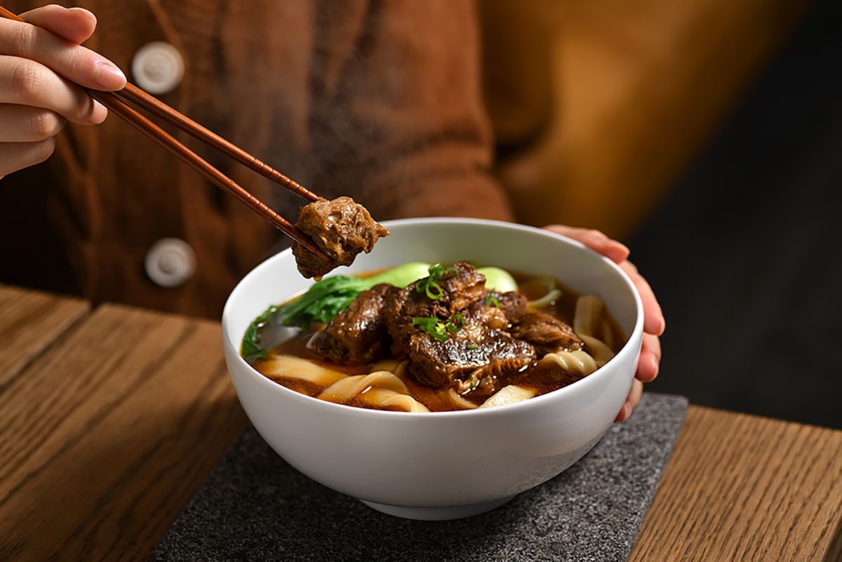 eslite hotel位於一樓的The Chapter Café全日餐廳,將人氣經典料理「炙燒澳洲和牛牛頰湯麵」轉化成單人份「炙燒和牛頰牛肉麵」外帶常溫禮盒。選用澳洲和牛最精華軟嫩又富含膠質的臉頰肉,以炙燒手法帶出誘人香氣,再經大量蔬菜、牛骨與嚴選香料細滷慢熬,以跳脫傳統紅燒牛肉麵的嶄新樣貌呈現,宅在家也能輕鬆品嚐飯店級美味!