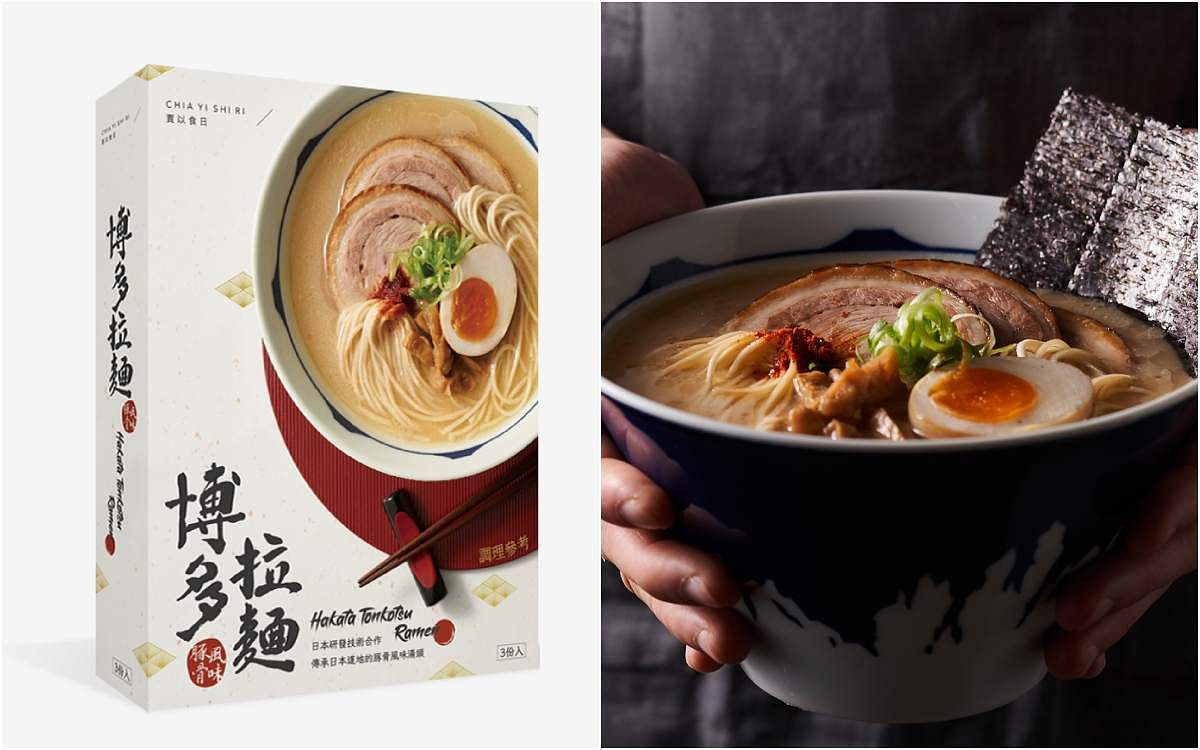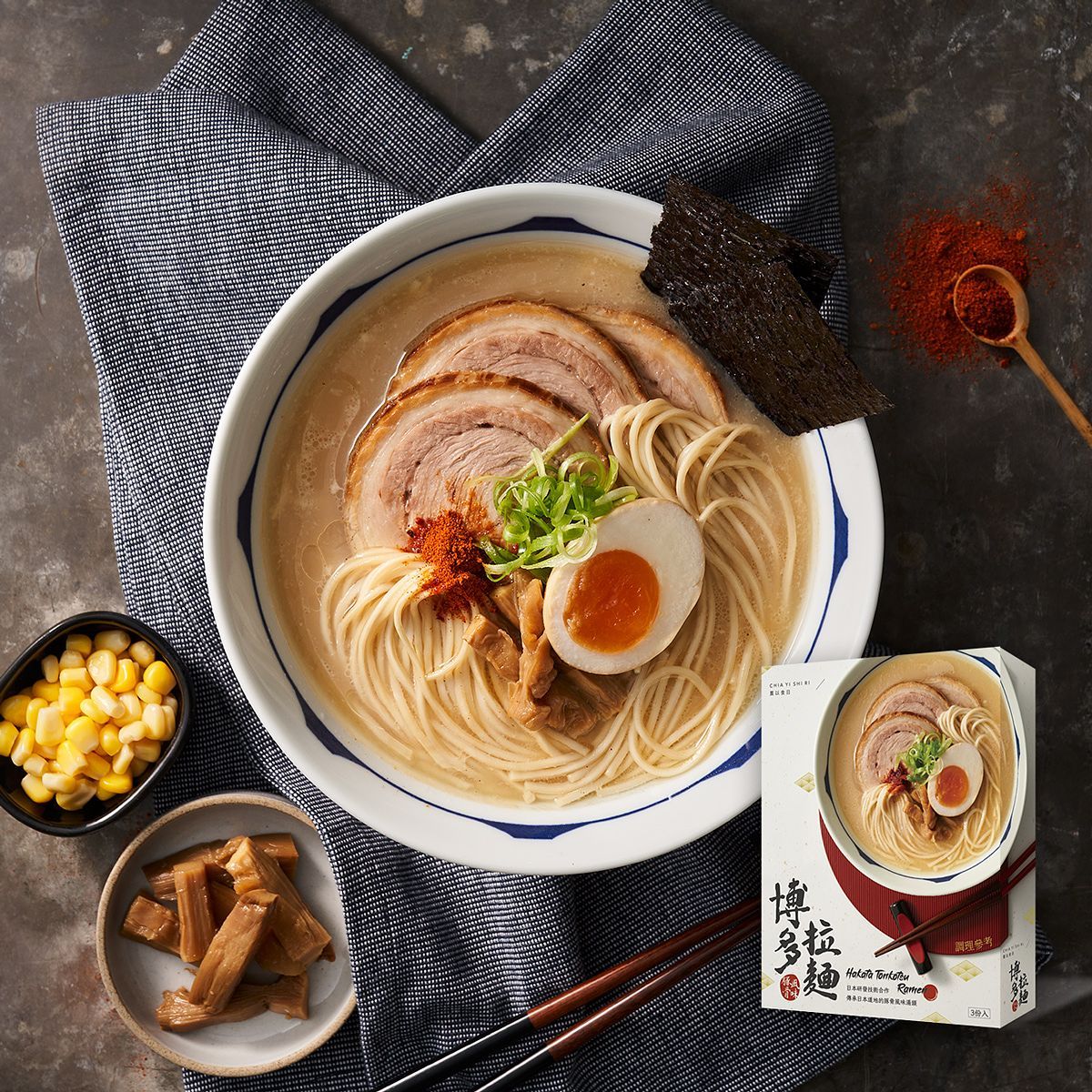 賈以食日除了招牌麻花面,全新推出日式風味『博多拉麵豚骨風味』,湯底由日本原裝進口並設計成醬包形式,加入熱水煮沸即可還原正統美味!簡單易操作的烹調方式,10分鐘內一碗香濃的豚骨拉麵就能上桌!