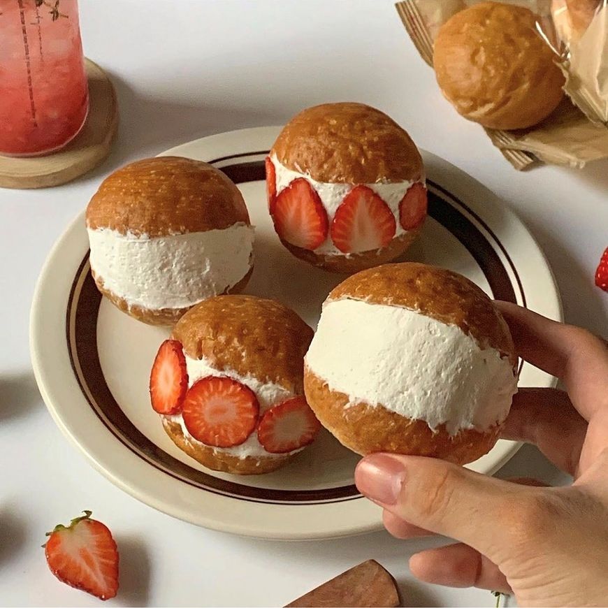 材料:市售現成鮮奶油、市售小餐包、草莓些許