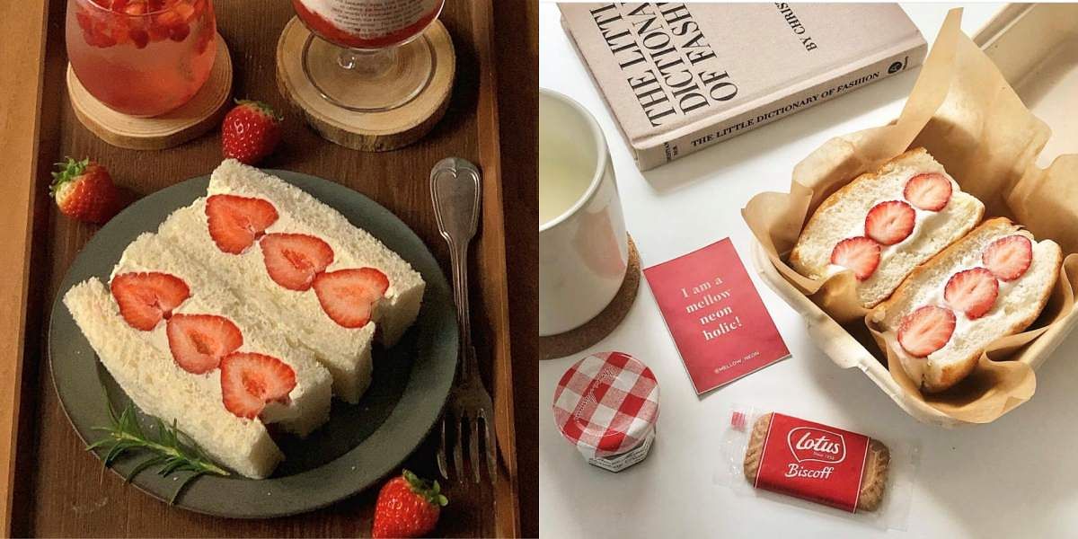 日本紅到翻的水果三明治,相信大家都已經不陌生了,但是看似簡單的三明治,講究的是要怎麼擺放才會有漂亮的切面!首先在吐司表面鋪上一層鮮奶油,再將完整的單顆草莓以直列的方式排在正中央,於排列的空隙填補鮮奶油,接著再於兩側排上切成對半的草莓。最後蓋上另一片吐司,壓緊後,切成對半就可以了。