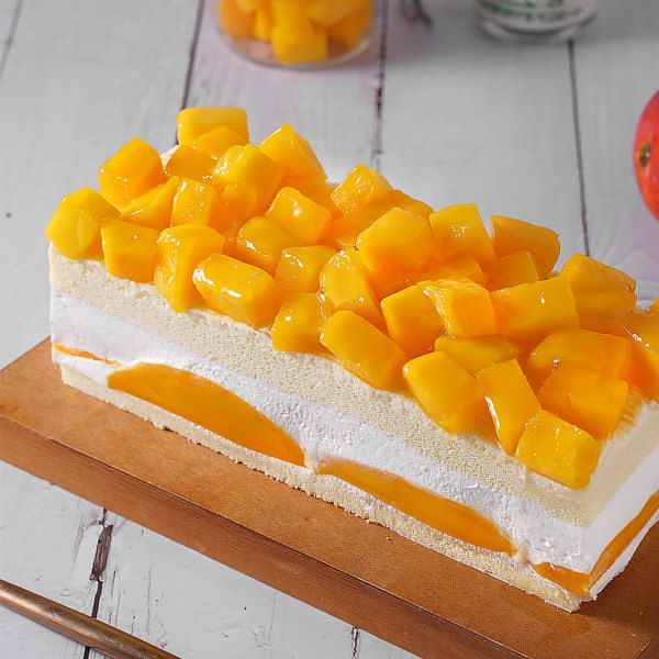 唐緹烘焙坊愛文芒果長條蛋糕,以整整兩顆半的新鮮國產芒果製成,將綿密香草戚風蛋糕結合大量的芒果丁、芒果切片,並加入滑順不甜膩的生乳奶黃醬慕斯,帶給你專屬夏日的多層次濃郁芒果滋味。