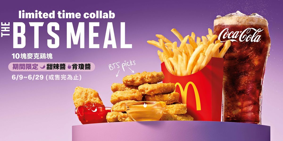 「THE BTS MEAL」期間限定款包裝10塊麥克鷄塊套餐也來到台灣了!BTS防彈少年團的最愛餐組內容包含大家都常吃的「10塊麥克鷄塊」、「中份薯條」、「中杯冷飲」,以及韓國直送的「甜辣醬」與「肯瓊醬」(兩款皆為辣醬,經典「醣醋醬」亦同時提供,可依個人喜好選擇兩款);「THE BTS MEAL」特定包裝與期間限定沾醬販售期間自6月9日起至6月29日或售完為止,其中兩款特殊口味的辣醬備貨百萬份,將視首週銷量陸續補貨。防疫期間,「THE BTS MEAL」於「歡樂送」、「foodpanda」及「UberEats」三大外送平台同步推出,歡迎消費者多加利用,不出門就能享用,讓麥當勞陪您一起齊心防疫守在家、品嚐美食免出門!