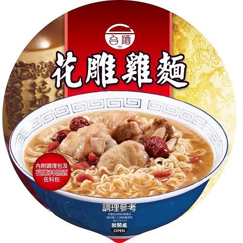 曾經讓台中市長盧秀燕因為買不到而質詢財政部長張盛和的台酒花雕雞麵,堪稱是台灣泡麵的傳奇。自2013年推出,特別使用臺灣菸酒公司15年以上的陳年花雕酒,再加上泡麵、佐料包、調味粉包還有雞肉調理包,據說製作時間必須長達3週才能造就的美味,連機場都有販售。