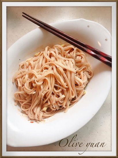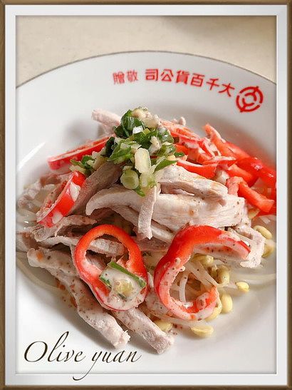 然後黃豆芽菜真的好便宜,一大包NT30不到,但就算每餐吃150根(因為我都會剪掉尾巴鬚鬚,所以就順便算了一下),還是無法在最新鮮的時候吃完,今天來做很快速的涼拌。底下是150根黃豆芽、上面是豬肉絲,川燙煮熟,再切一點紅椒,最上面鋪的是蔥薑蒜,淋上芝麻醬還有一些辣油就完成了。