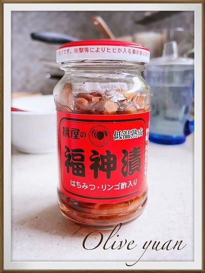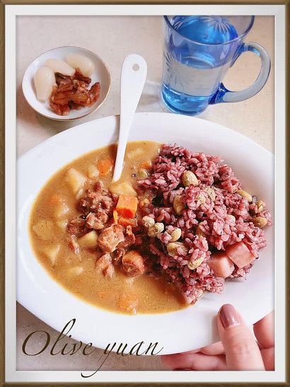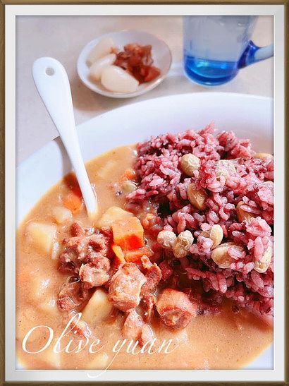 吃咖喱就是要有福神漬跟蕗蕎,但一般來說吃咖喱不需要配菜,主要是日本明治時期的飲食習慣,而且吃咖喱配福神漬只有高級餐廳才有。福神漬通常都會有「白蘿蔔、茄子、四季豆、蓮藕、黃瓜、紫蘇、香菇」等七種蔬菜,我大推「桃屋福神漬」,因為它是用蜂蜜跟蘋果醋醃漬的,特別爽口。我吃的是紫米飯,裡面還混了馬鈴薯跟毛豆一起煮!