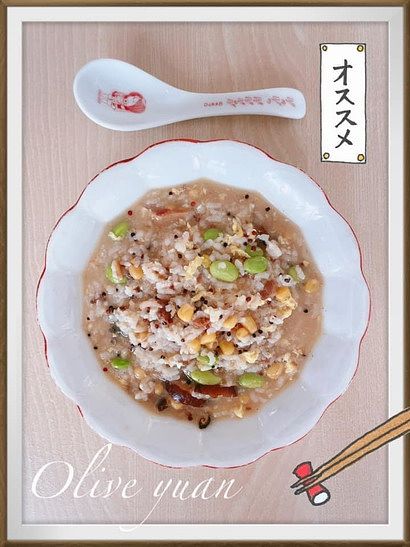接著把白米飯變成鹹粥,藜麥給它加量,然後除了玉米、毛豆、魯肉醬,再加入乾燥香菇、油蔥、蛋花來增加「台味」,最後是大量的黑胡椒。我還奢侈的開了一罐「同榮番茄汁鯖魚」來增加蛋白質,剩下的一半,晚上可以吃番茄汁鯖魚粥。