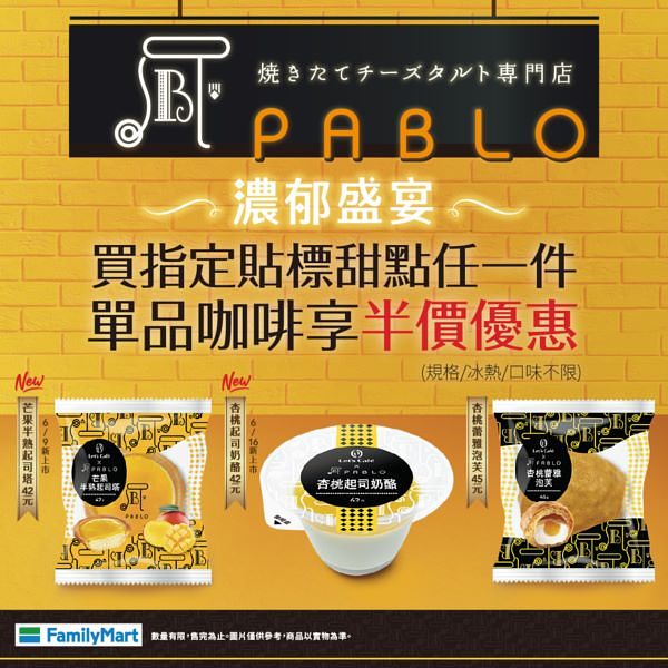 炎夏悶熱、疫情讓生活充滿壓力,簡單卻充滿幸福滋味的甜點配杯咖啡,無疑是此刻撫慰人心的最佳療癒聖品!PABLO前一陣子與全家便利商店跨域聯名,合作推出多款獨家商品深受市場好評,社群平台討論熱度更是居高不下,刮起手刀搶購炫風! PABLO趁勝追擊此波熱潮,與全家便利商店再次攜手聯名兩款產品:6/9推出「PABLO芒果半熟起司塔」及6/16推出「PABLO杏桃起司奶酪」,同時結合全家便利商店「濃郁盛宴」活動,即日起~6/29買指定貼標甜點任一件,單品咖啡可享半價優惠;在此時生活區域有所限制的影響下,也能在全省三千八百多間全家便利商店,享受來自PABLO的解悶甜品。
